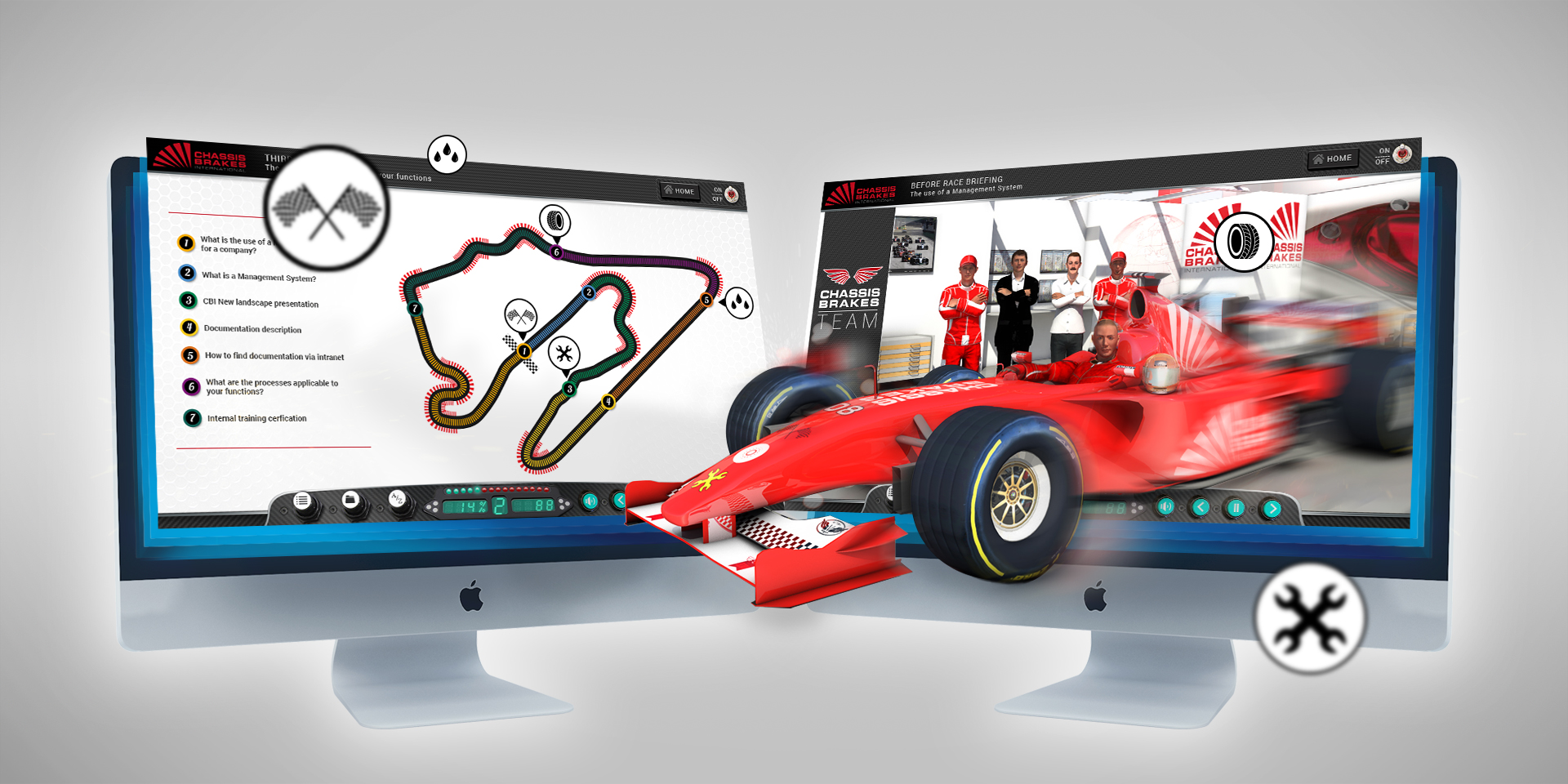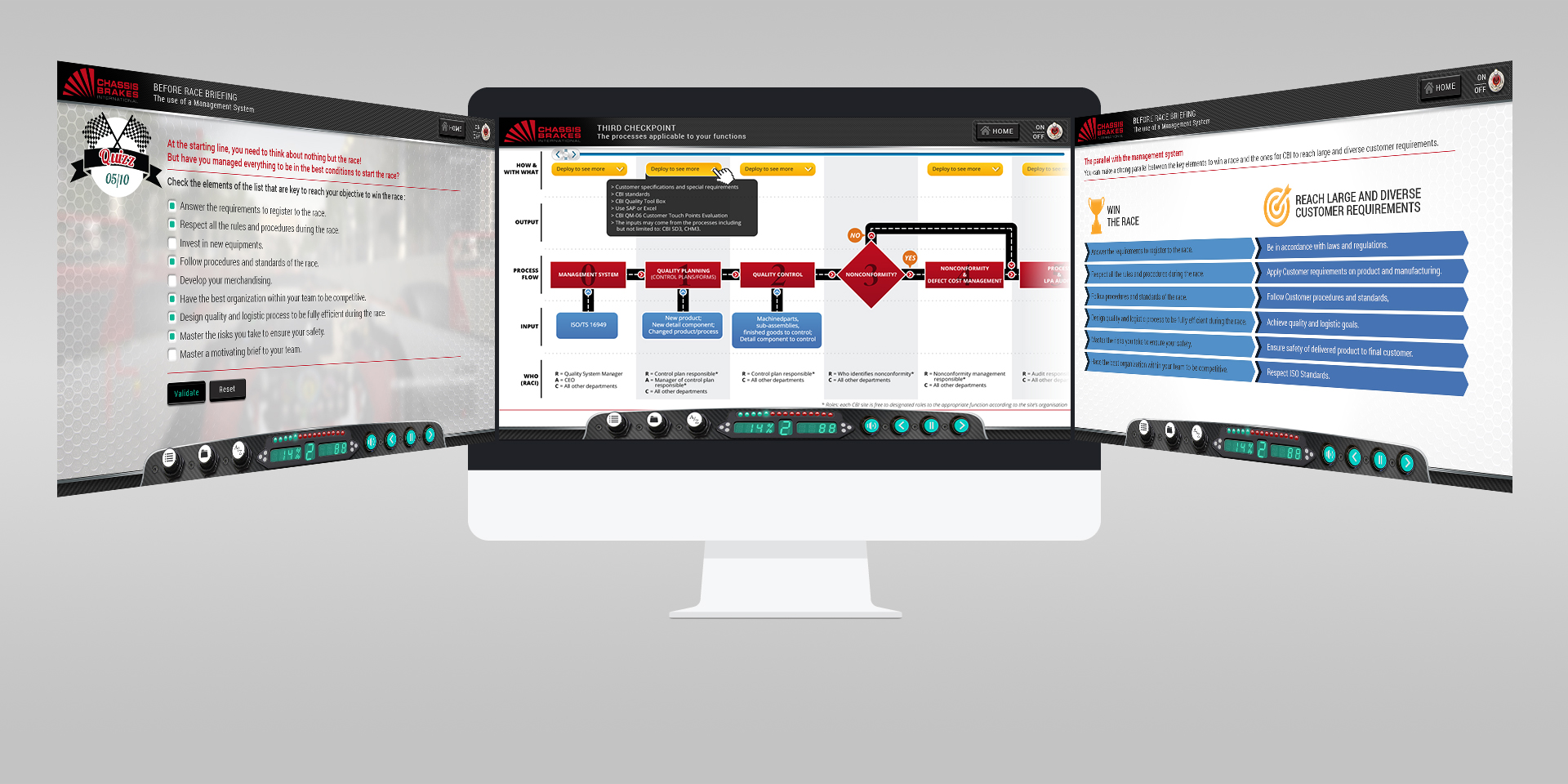 Proposition d'une ambiance graphique autour de la F1 afin de créer un impact stimulant au parcours pédagogique. Design de l'Interface Homme Machine (IHM) à partir des éléments codés d'un volant réel de F1.